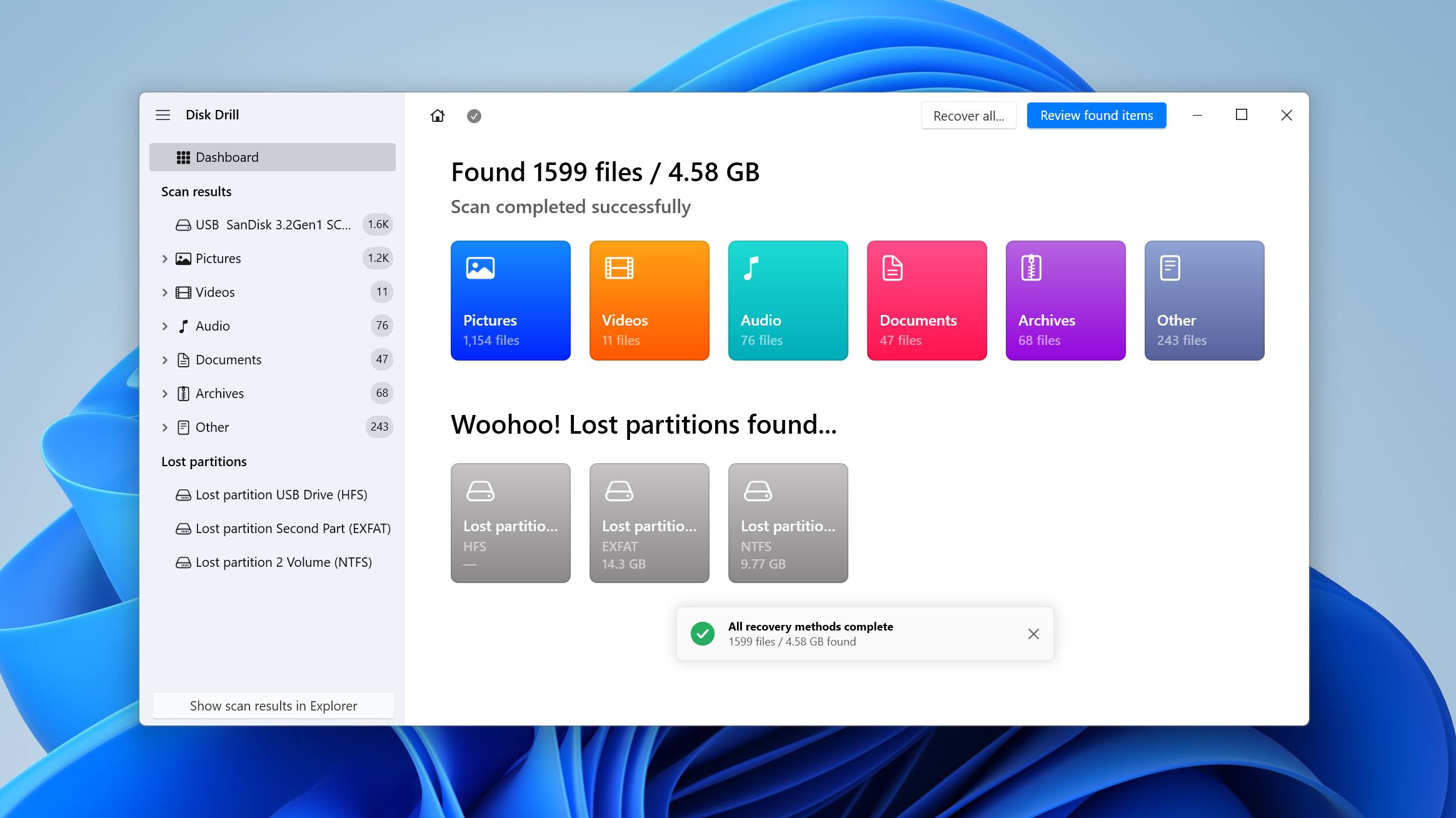 Yes. Disk Drill is a reliable data recovery tool that can recover many types of lost files, including documents, photos, videos, audio files, and archives, from storage devices recognized by Windows. Its success depends on factors such as how the data was lost and whether the underlying file system metadata or file data has been overwritten.